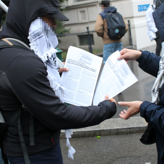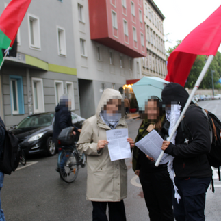 Unter anderem wurde die Redaktionserklärung LINK auch auf einer Demonstration der Palästinasolidaritätsbewegung verteilt. Die Demonstration, deren Ziel die US-amerikanische Botschaft in Wien war, richtete sich gegen die Unterstützung des Völkermordes in Palästina.