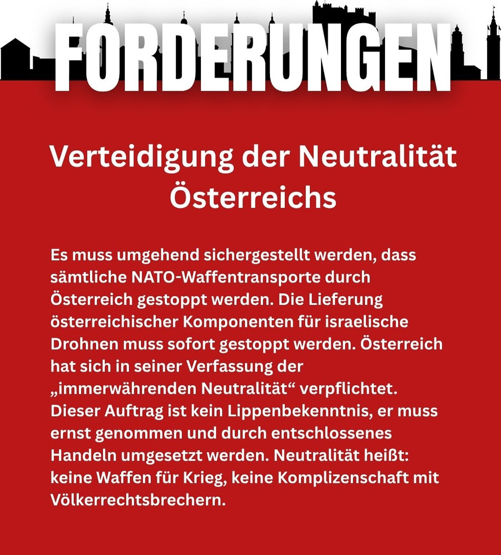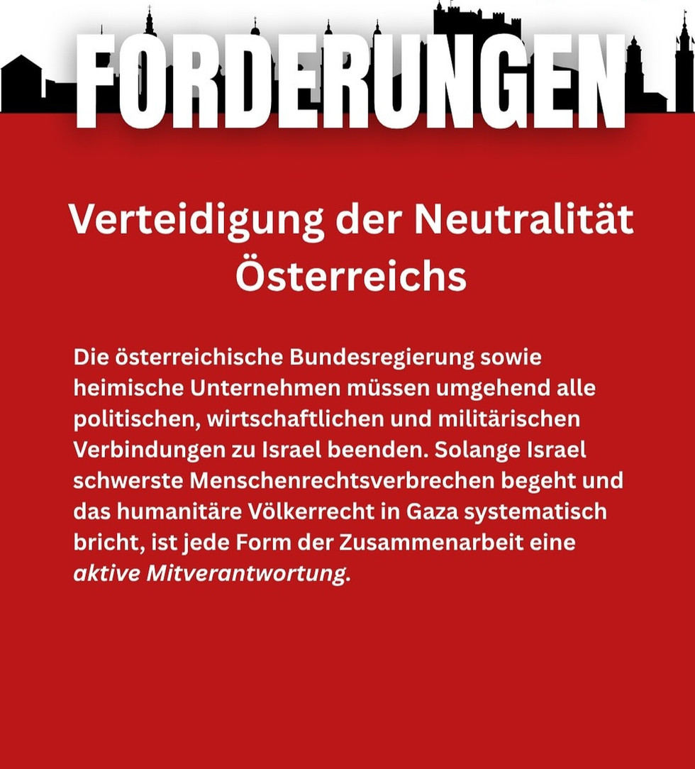 In der Presseaussendung der Palästinaaktivisten heißt es: „Die Festspiele verstehen sich 2025 als Ort des künstlerischen Widerstands gegen Krieg und Unterdrückung – doch zur Gewalt in Gaza schweigen sie. Warum? Diese Leerstelle ist politisch opportun. Wir fordern das Direktorium auf, palästinensische Stimmen sichtbar zu machen und der Grausamkeit der Verbrechen in Gaza nicht länger auszuweichen. Kunst darf nicht nur dort kritisch sein, wo es bequem ist.“ Sie fordern weiters „Sanktionen gegen Israel“, „Verteidigung der Neutralität Österreichs“ und „Schluss mit der Verdrehung des Antisemitismusbegriffs“